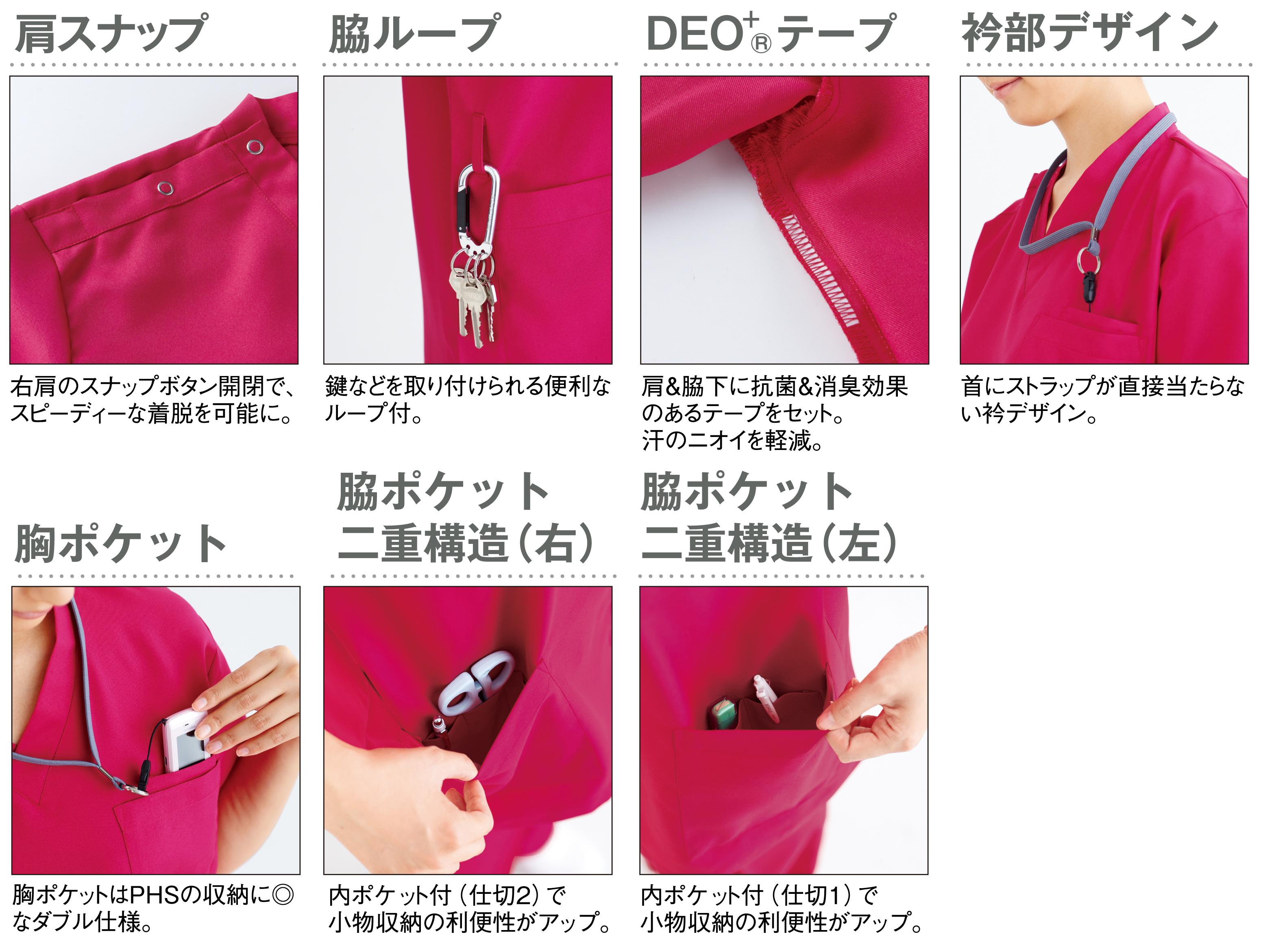 左胸二重ポケット/両腰二重ポケット/右脇ループ/肩・脇下DEO+テープ付